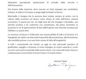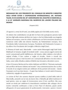 MESSAGGIO DEL VICE PRESIDENTE DEL CONSIGLIO DEI MINISTRI E MINISTRO DEGLI AFFARI ESTERI E COOPERAZIONE INTERNAZIONALE, ON. ANTONIO TAJANI, IN OCCASIONE DEL 69° ANNIVERSARIO DEL DISASTRO DI MARCINELLE, E LA 24° GIORNATA NAZIONALE DEL SACRIFICIO DEL LAVORO ITALIANO NEL MONDO
