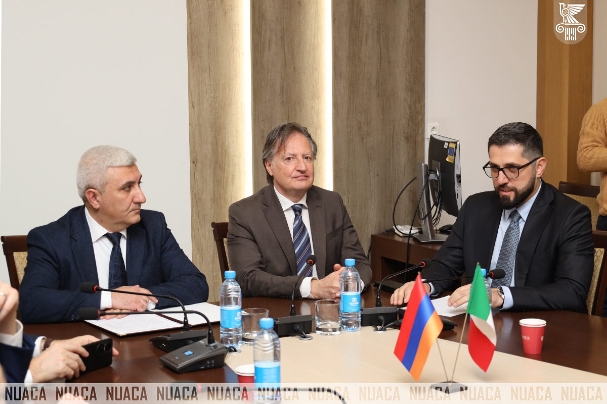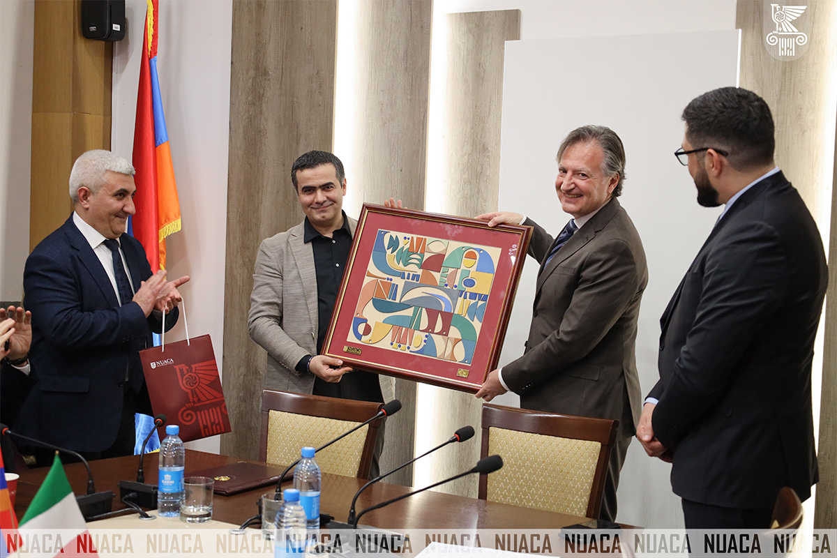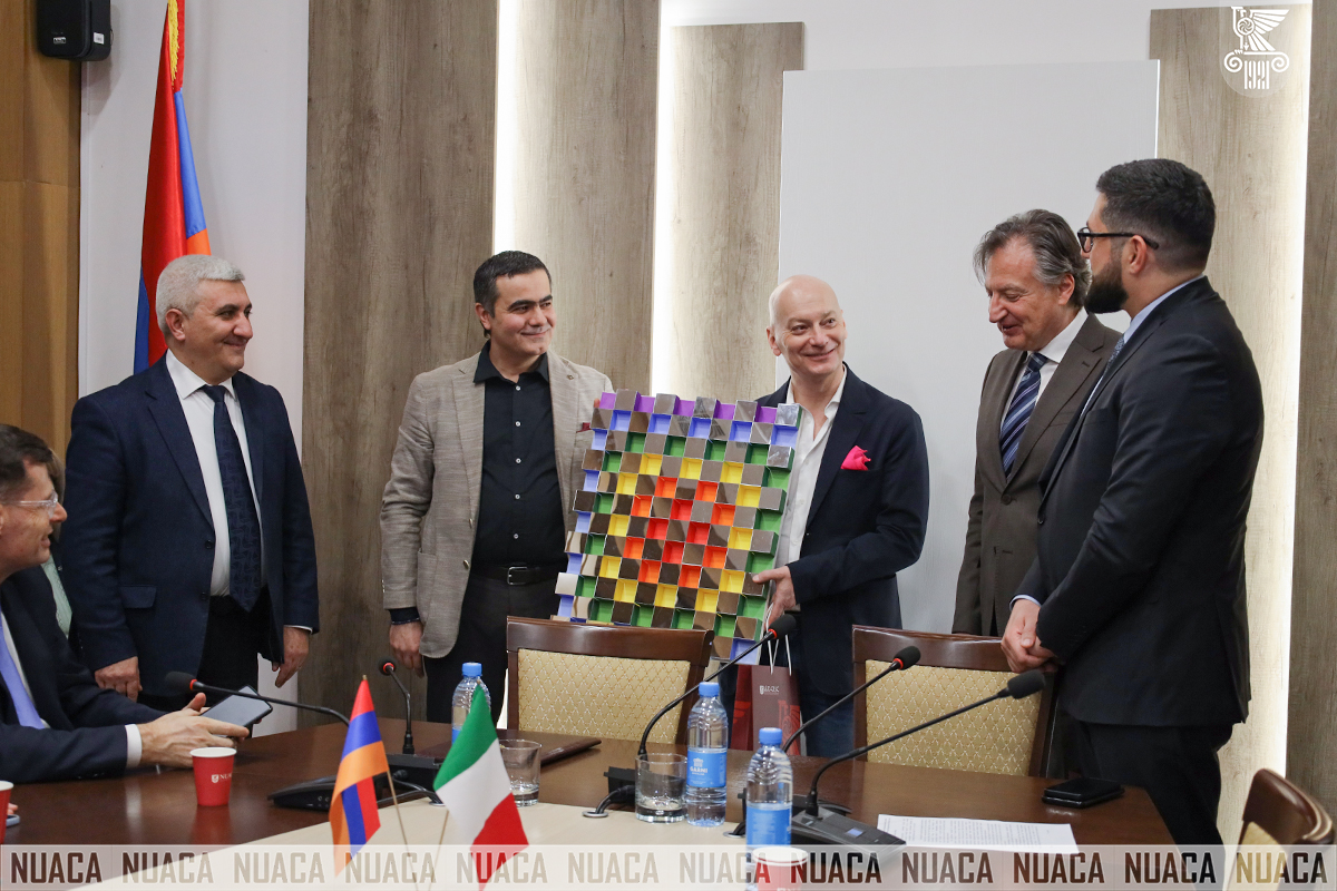 Nella giornata del 23 marzo, accompagnato da una delegazione dell’Ambasciata, l’architetto Poletti è stato invitato a tenere una lectio magistralis presso l’Università Nazionale di Architettura e Costruzione (NUACA) di Jerevan. Rivolgendosi alla platea di studenti e docenti, alla presenza del Rettore Manuk Gevorg Barseghyan, Poletti ha condiviso la propria esperienza professionale e spiegato il processo creativo che sottende alla realizzazione di un prodotto di design, ricercando l’equilibrio tra estetica emozionale e innovazione tecnologica. Illustrando la sua filosofia, egli si è soffermato sui linguaggi del tempo, ovvero sulla capacità di trasformare un’intuizione sul futuro in una realtà progettuale presente, creando oggetti che non invecchiano perchè pensati per il tempo che verrà.