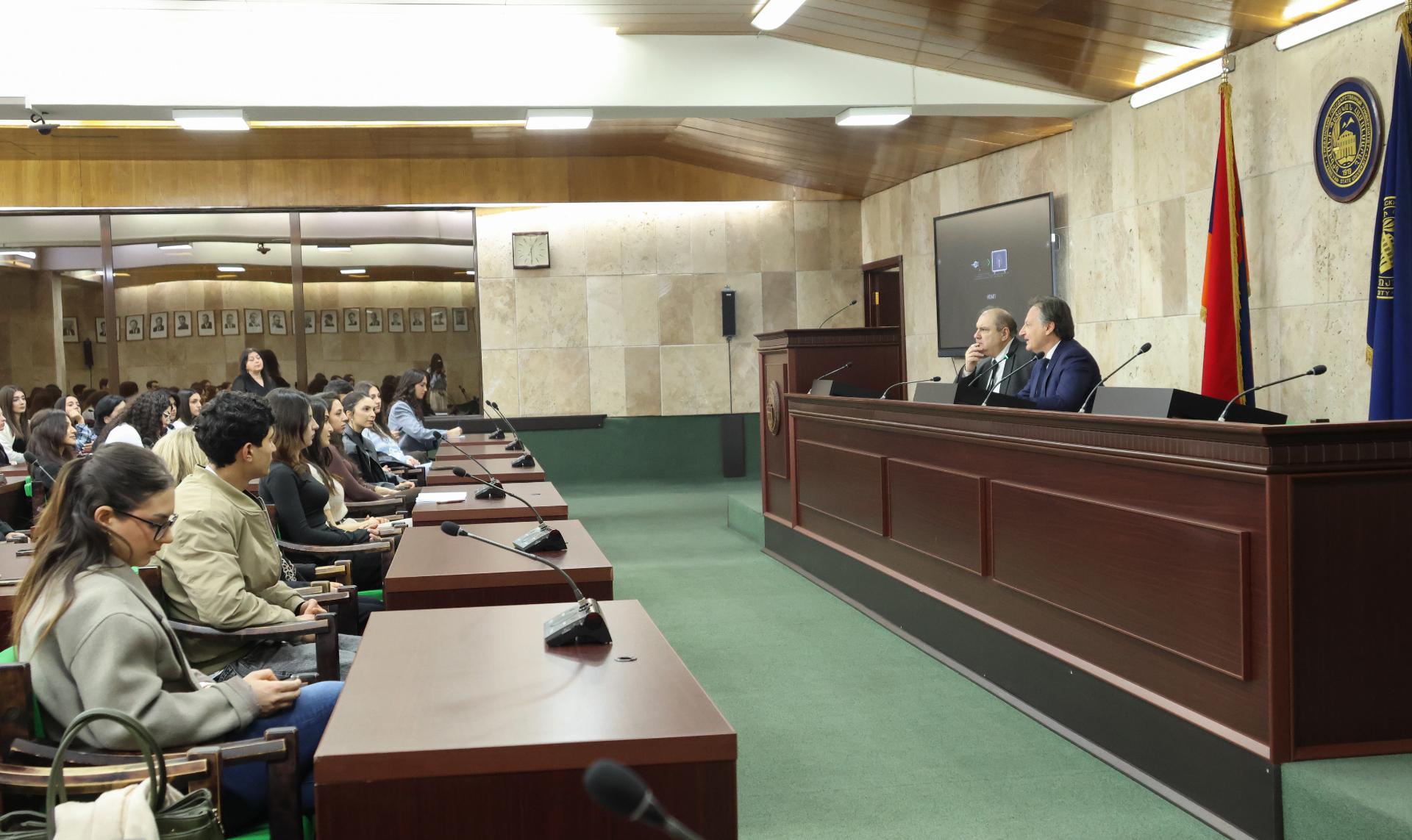 A seguire, nell’ambito del ciclo di incontri organizzati dall’Università con i Capi delle Missioni diplomatiche accreditate a Jerevan, rivolgendosi alla platea degli studenti l’Ambasciatore Ferranti ha dato particolare rilievo al concetto di italianità, da intendersi come presenza dell’Italia nel mondo, anche quale espressione e strumento di “soft power”, e al ruolo della cultura quale piattaforma privilegiata per il dialogo tra Paesi, con particolare accento alle relazioni Italia-Armenia.